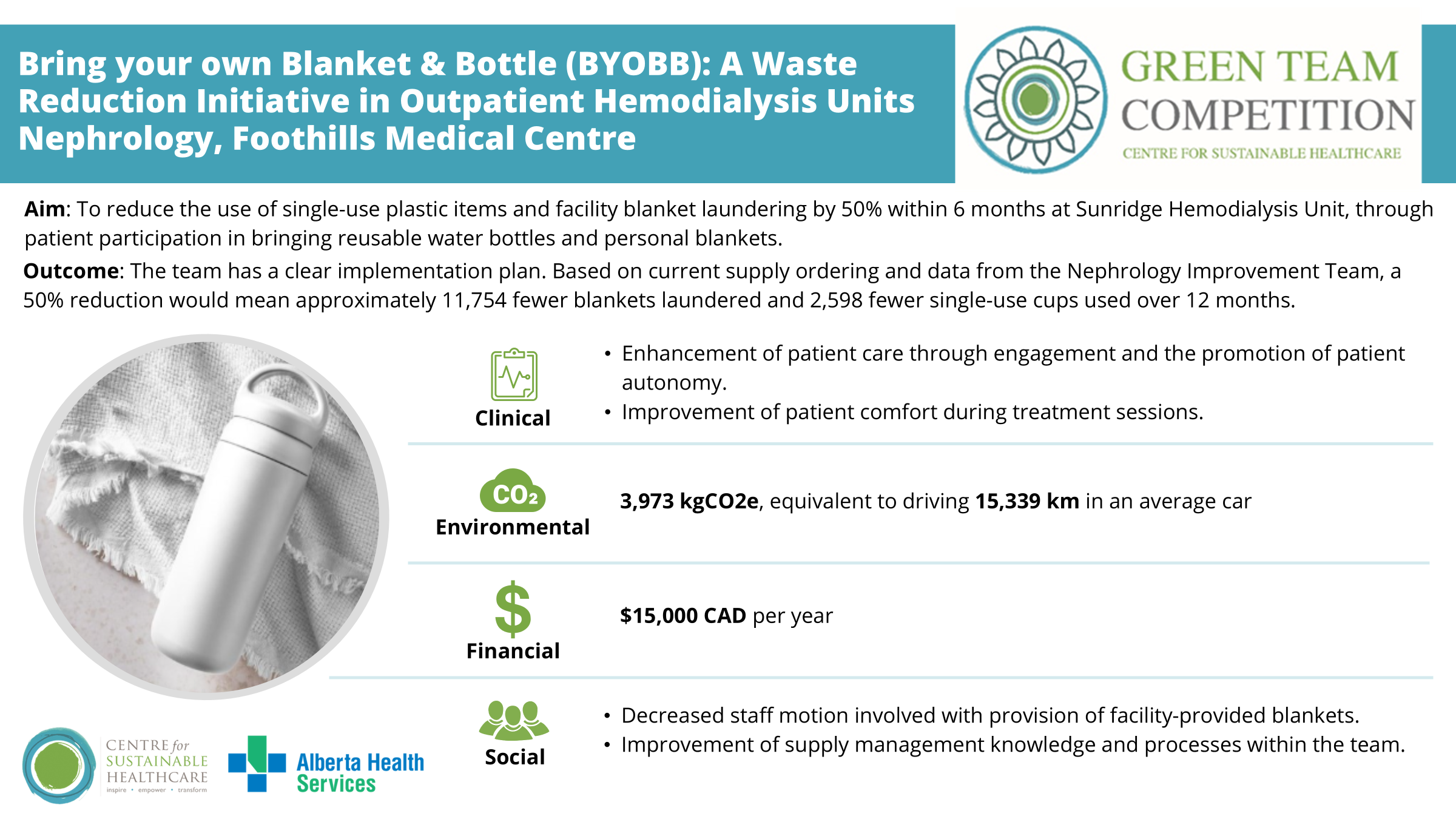 Aim: To reduce the use of single-use plastic items and facility blanket laundering by 50% within 6 months at Sunridge Hemodialysis Unit, through patient participation in bringing reusable water bottles and personal blankets.