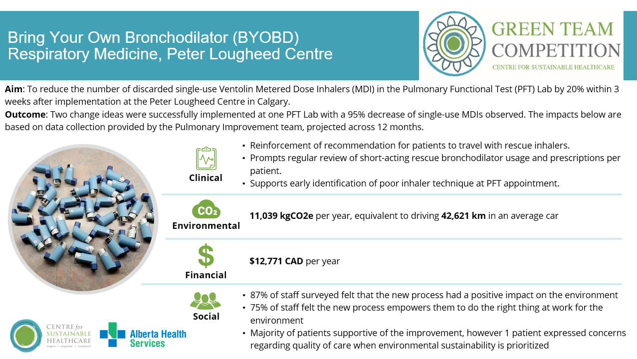 Pulmonary function testing (PFT) often requires bronchodilator responsiveness (BDR) testing using a short-acting bronchodilator, typically salbutamol (Ventolin) via metered dose inhaler (MDI). In all Calgary Zone hospital-based PFT labs, a single-use Ventolin MDI is used per patient, delivering only 4 puffs. Some of these inhalers are subsequently provided to the patient, if desired and deemed appropriate by their treating physician. However, many are discarded with approximately 98% of the medication remaining. This practice results in significant waste and environmental impact, especially given the high carbon footprint of each inhaler, despite many patients potentially having their own prescribed inhalers suitable for testing.