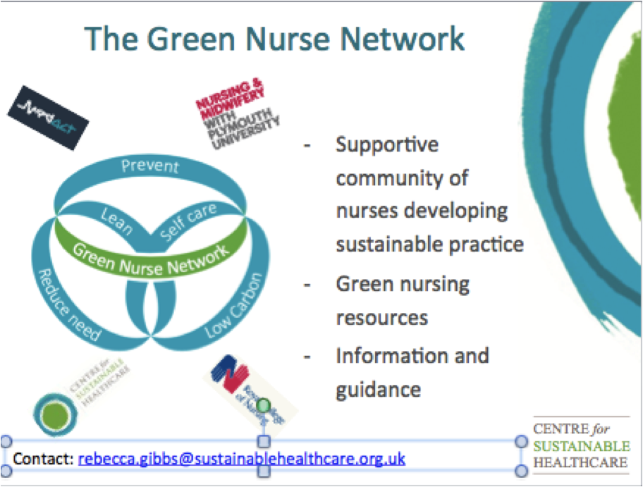 Nurses are the biggest healthcare profession and are uniquely placed, as they support the patient's journey through the health system to lead changes for prevention, the support of self care and lean patient pathways. This informal network is designed to allow nurses, students and nurse educators to collaborate on designing and communicating sustainable nursing practice. In her support Janet Davies, Chief Executive and General Secretary of the Royal College of Nursing said: