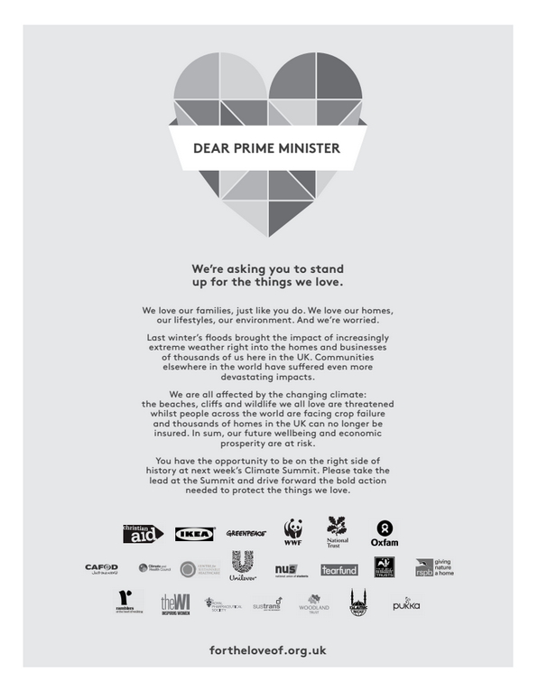 In a full page advert in the Times and Telegraph newspapers on 16th September 2014, the Climate Coalition, which brings together over 100 organisations with a combined supporter base of 11 million people, calls on the Prime Minister to “take the lead at the Summit and drive forward the bold action needed to protect the things we love” from the impacts of climate change.
