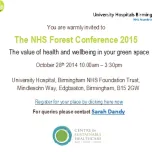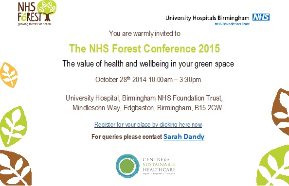 We are delighted to announce our 2015 NHS Forest Conference on the 28th September at University Hospital, Birmingham. The theme is “The value of health and wellbeing at your green space” with agenda items including “how to make your green space more accessible” and “how to convince health professionals green space is a good idea”.