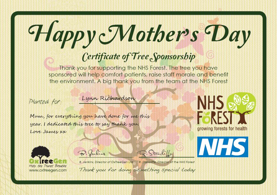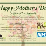 Mother's Day is just around the corner. Planting a tree for your Mum is just the perfect give. It will provide enjoyment, green space and cleaner air for generations to come. If you would like to sponsor a tree for the NHS forest in your Mother's name click here and you or your Mum will receive a personalized Mother's Day certificate.